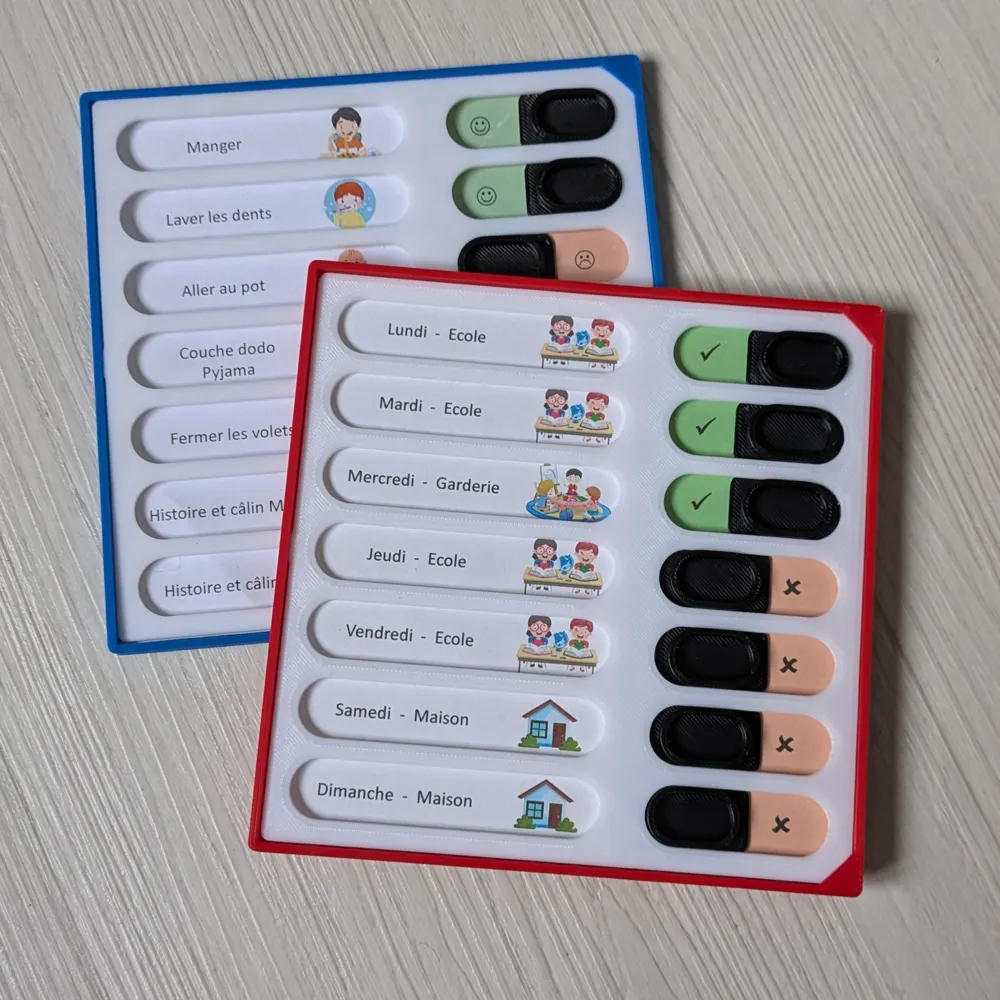 O modelo conta com slots modulares que possibilitam a inserção de blocos indicativos de tarefas, permitindo que a criança acompanhe visualmente suas atividades ao longo do dia. A estrutura foi projetada para oferecer boa resistência mecânica, estabilidade e fácil manuseio, sendo compatível com os principais padrões de impressão 3D.
